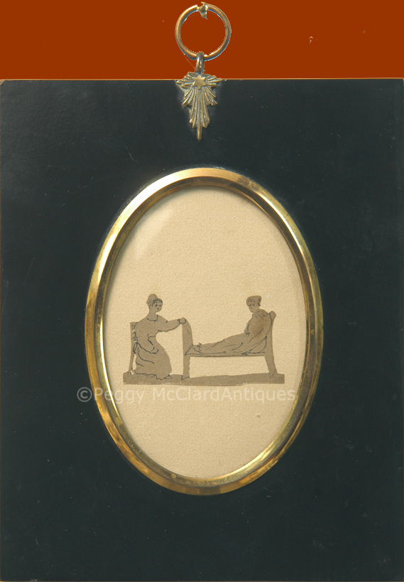 A tiny little cut & paste conversation silhouette of a seated woman visiting a woman lounging in a day bed. Although the figures are only 1” tall and the cut-out floor which forms the base of the one-piece cutting is only 2” wide, these tiny figures show lots of detail and personality. The artist cut the silhouette from sepia-colored paper and painted tiny details in black watercolor. We can see hair, jewelry, details in clothing, including both bonnets, and some detail of the wooden chair and daybed. The facial features are, of course, minimally detailed (they are tiny after all), but the tiny little silhouette smacks us in the face with charm and creativity. This little silhouette is likely from a scrapbook. It resides in a period papier mâché frame that measures 5 ½” x 4 ½”. The frame includes a very nice starburst brass hanger. A nice little rarity, circa 2nd quarter of 19th century.