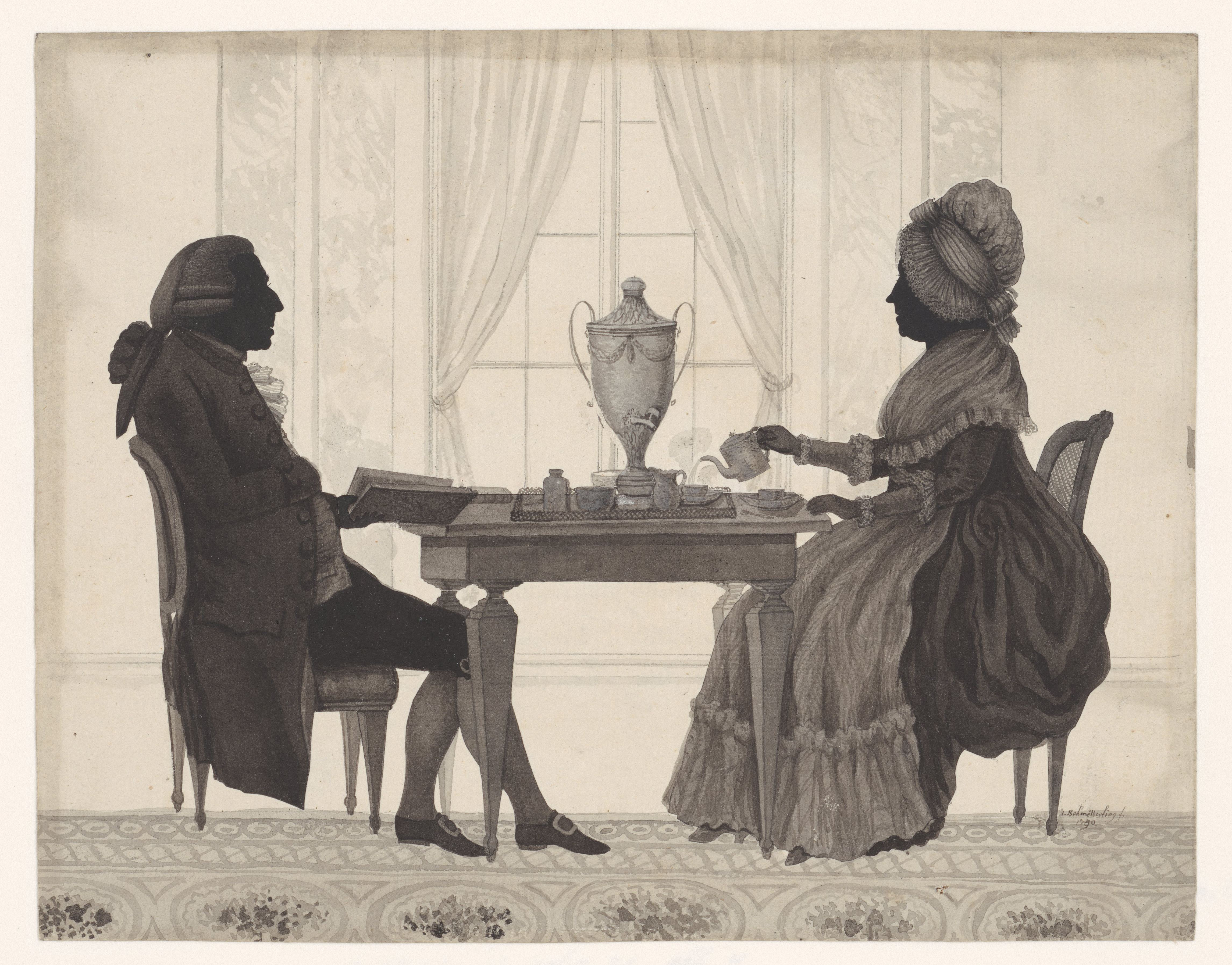 We have very little history for Joseph Adolf Schmetterling. But we know that he produced marvelous silhouettes, both cut with painted details and fully painted. According to RKD-Netherlands Institute for Art History, he was Austrian, born in Vienna in 1751 and died in Amsterdam on August 19, 1828. He was active in Amsterdam circa 1778-1828. Schmetterling was a painter of portrait miniatures and paper-cut artist of the North Netherlandish School. Along with his profiles and portrait miniatures, Schmetterling left us painted Christian religious scenes and drawings of village scenes. His detailed drawing of Venus Gentrix resides in the Rijksmusuem along with other pieces of his work. Schmetterling’s work is rare to find, especially outside of the Netherlands where the few known pieces reside in museums and private collections. The detail is simply fantastic! He taught his two daughters Christina Josepha and Elisabeth Barbara. The work of his daughters is also highly collected and treasured by collectors and museums alike.