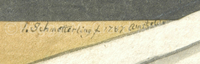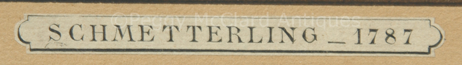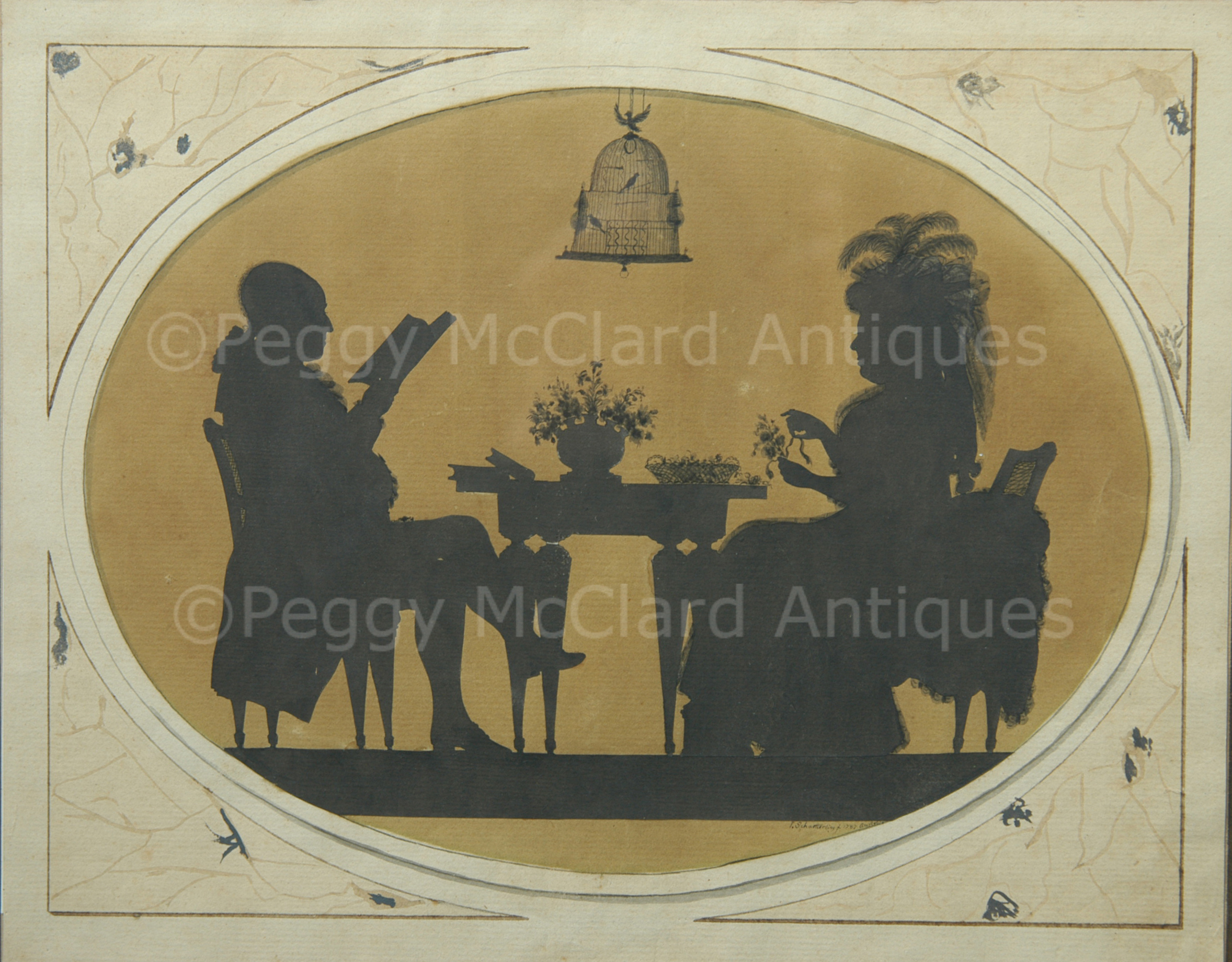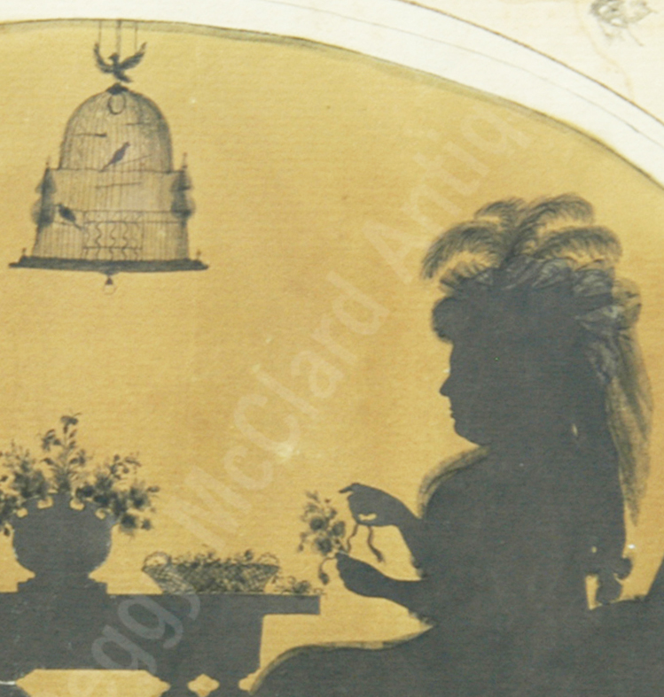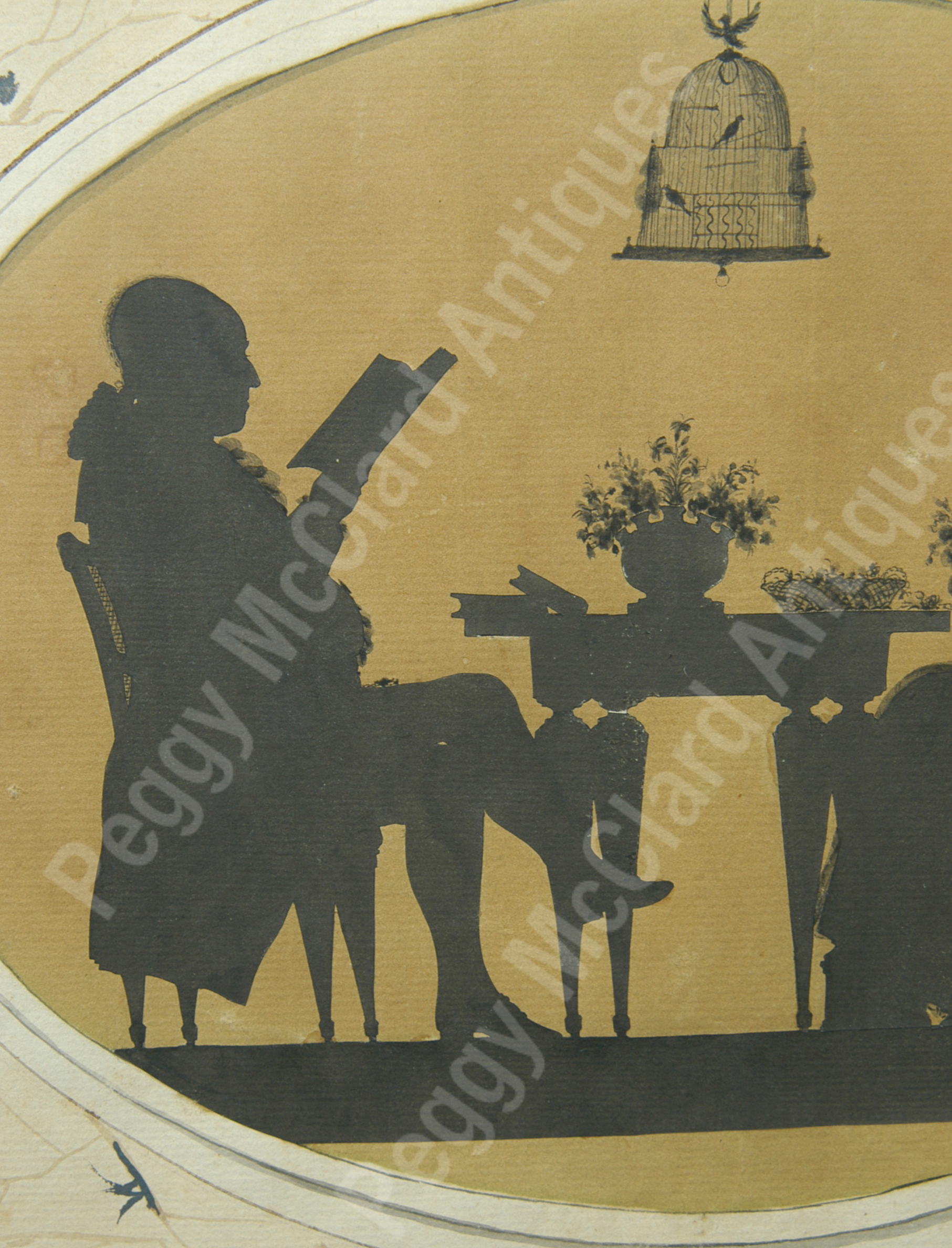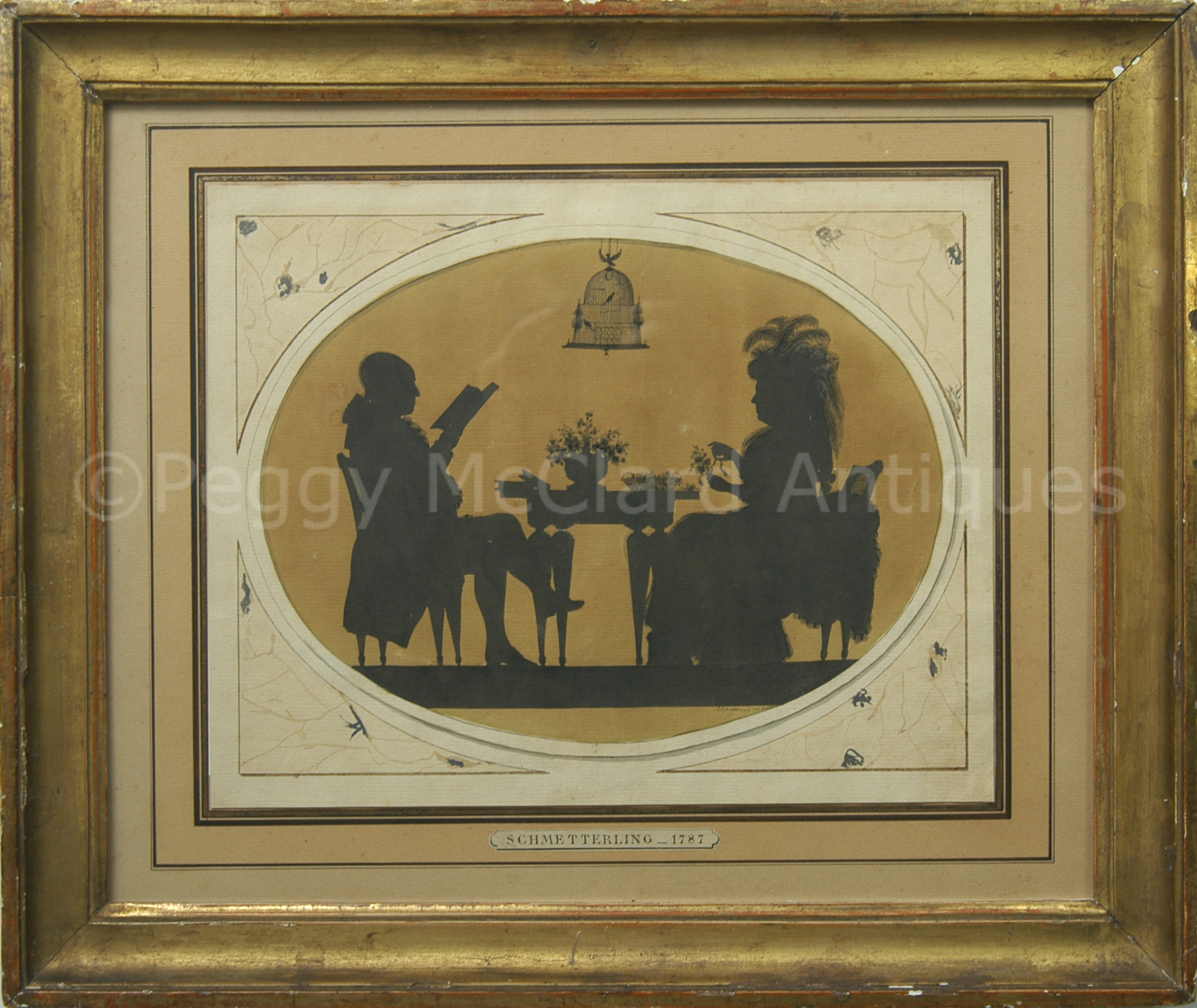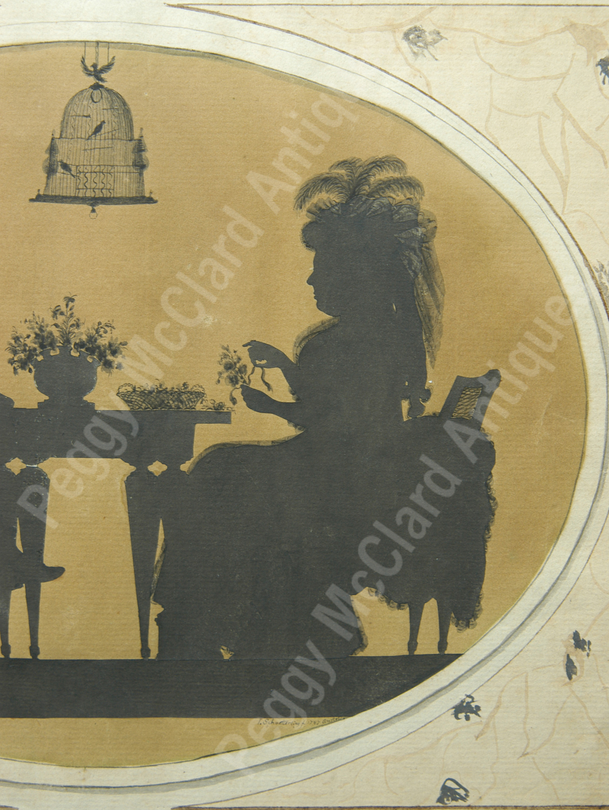 This is a really special cut silhouette with beautiful penned and/or painted details of the clothing frills, the woman’s feathered hat, flowers in her hand and the vase on the table, her sewing basket, and the birdcage. The painting around the cut profiles is so seamless that it looks like a fully painted silhouette. Schmetterling paid such attention to detail that he even paint-decorated the spandrels around his painted oval portal to look like marbled paper. This fabulous 18th century conversation silhouette is signed and dated directly below the painted floor, in the right corner, I. Schmetterling f. 1787 Amsterdam. Interestingly, he seems to have run out of space for “Amsterdam” so it kind of crawls up the oval outline. Perhaps the sitters decided they wanted the shade to include their home city after he had already finished and signed the piece—so he went back and added it in a space too small to fit. The signature is spot on for other online works that I’ve compared with it. He generally seems to have signed “I. Schmetterling” although his portrait miniatures might have simply his initials “I.S.”. Remember that “J” did not exist in early alphabets and was substituted with “I”.
