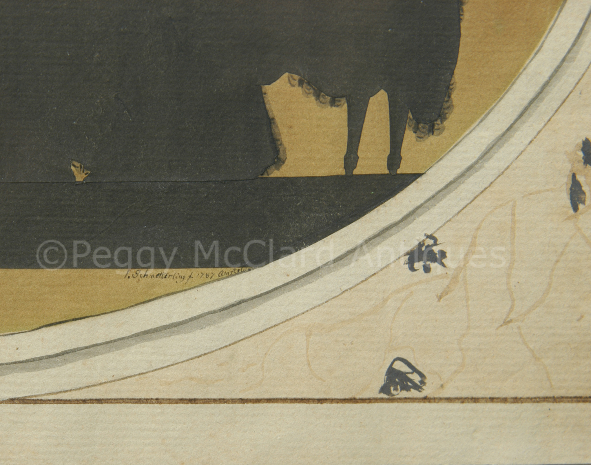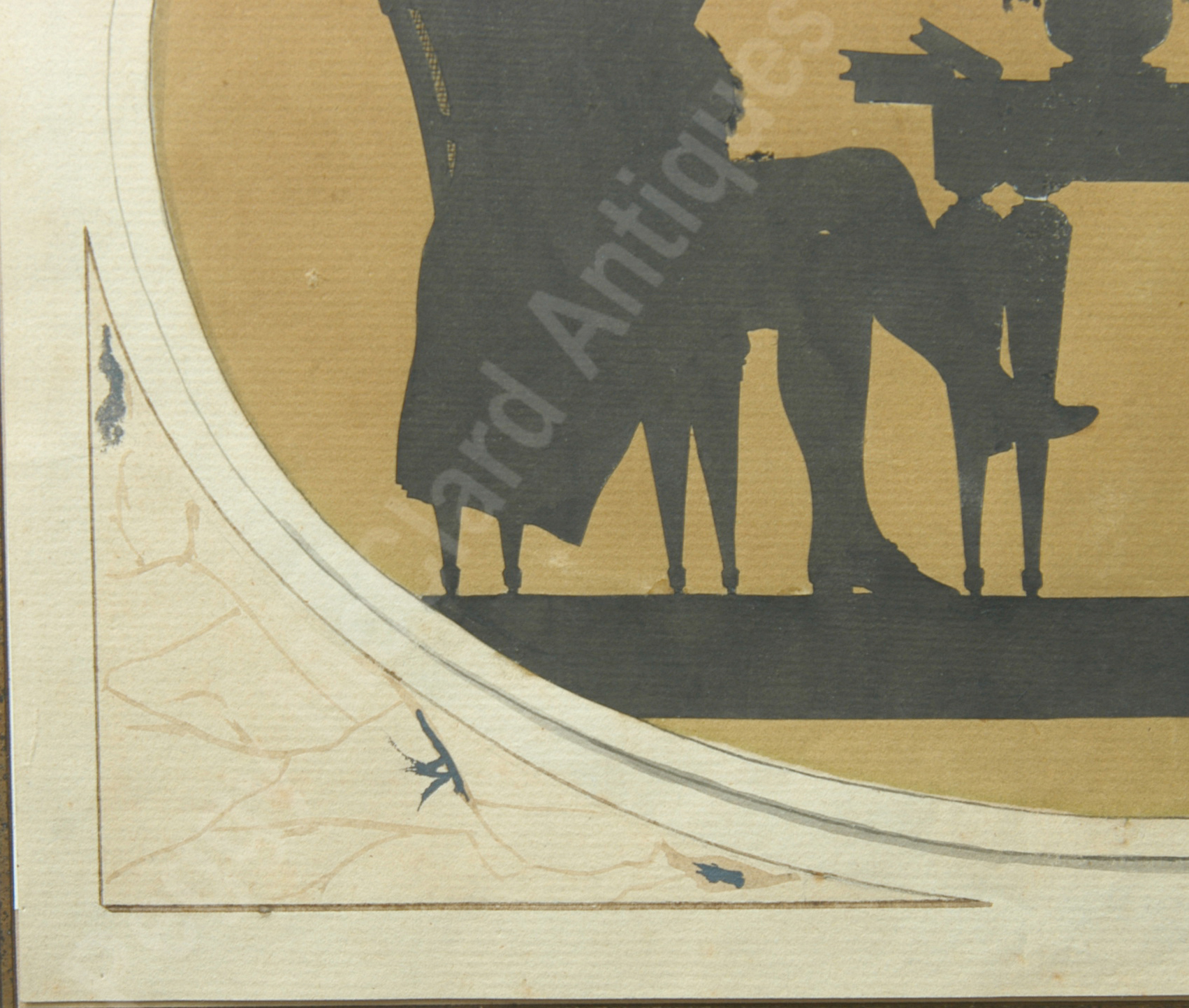 This desirable silhouette must have been one of her favorites because she had it framed in her special way that she had many of her pieces framed. It is in a period gilt frame that measures 19” x 16”. Within the frame she had conservation mat used to surround the piece and to keep the glass from touching this piece of history. Within the acid-free mat, Ms. Peyraud had the laid paper of the silhouette hinged onto another piece of acid free mat so that you can see the entire piece of paper. The paper measures 12 ½” x 10”. Ms. Peyraud purchased this rare silhouette from Post Road Antiques in Larchmont, New York in November 1975. The paper within the oval is heavily toned while the paper outside the oval is not. This leads me to believe that Schmetterling toned the oval to accentuate the black figures. As you can see in the close up photos, the laid paper outside of the paint decorated area has very little toning although it has no paint to have protected it. The paper is not brittle—I’m saying all of this because I really believe that Schmetterling used some method of toning just the paper within the oval. This is a really fascinating piece that can serve as the centerpiece of a silhouette collection. How many times do you find an 18th century silhouette at all, lest one is such wonderful condition with such a great composition? I don’t find them very often!